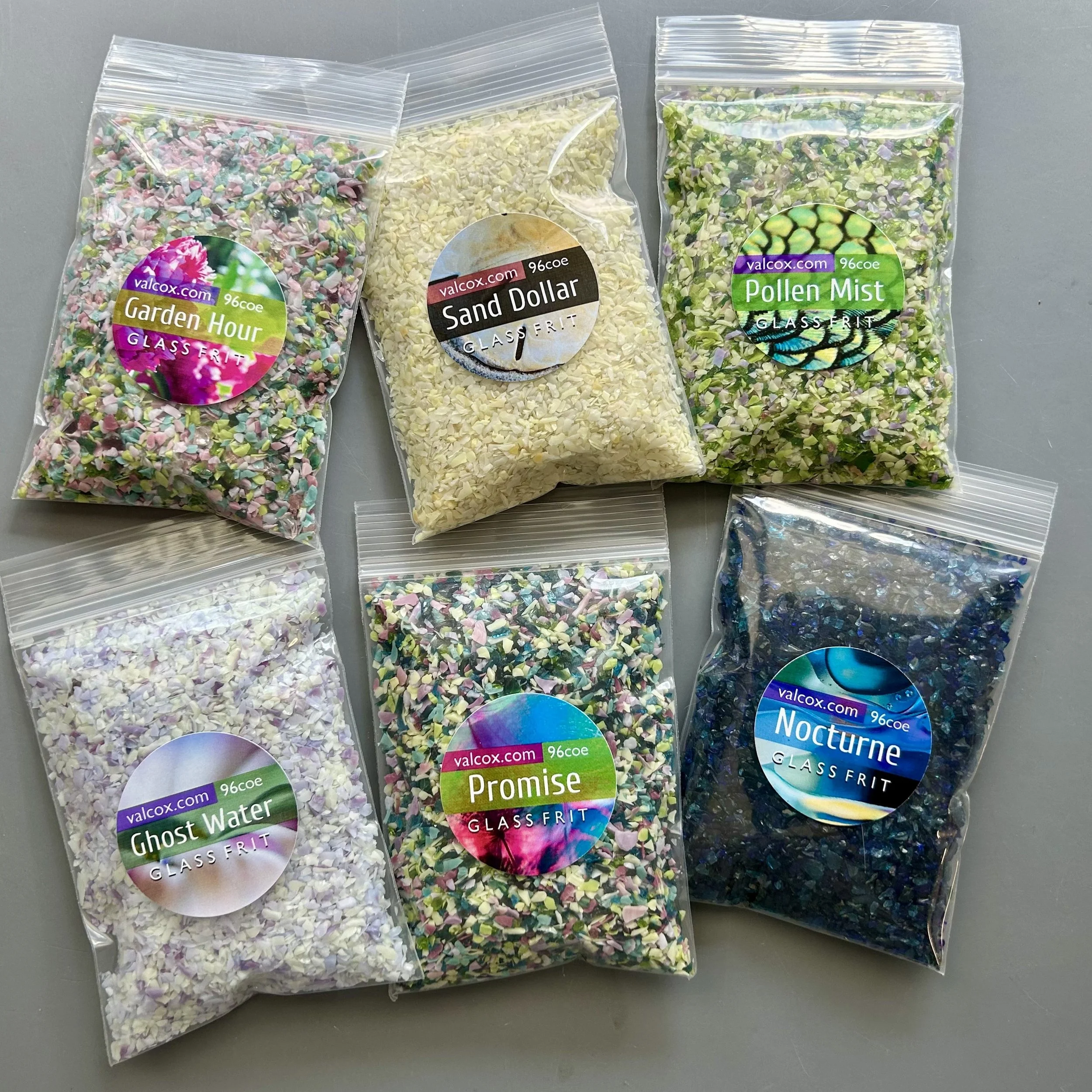 Six new 96coe glass frit blends ready for shipping.